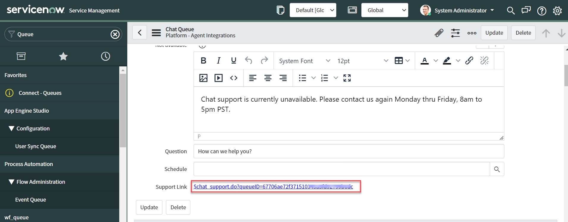 If you want to make ServiceNow as the default agent, enable the Default Agent System for all app channels option.