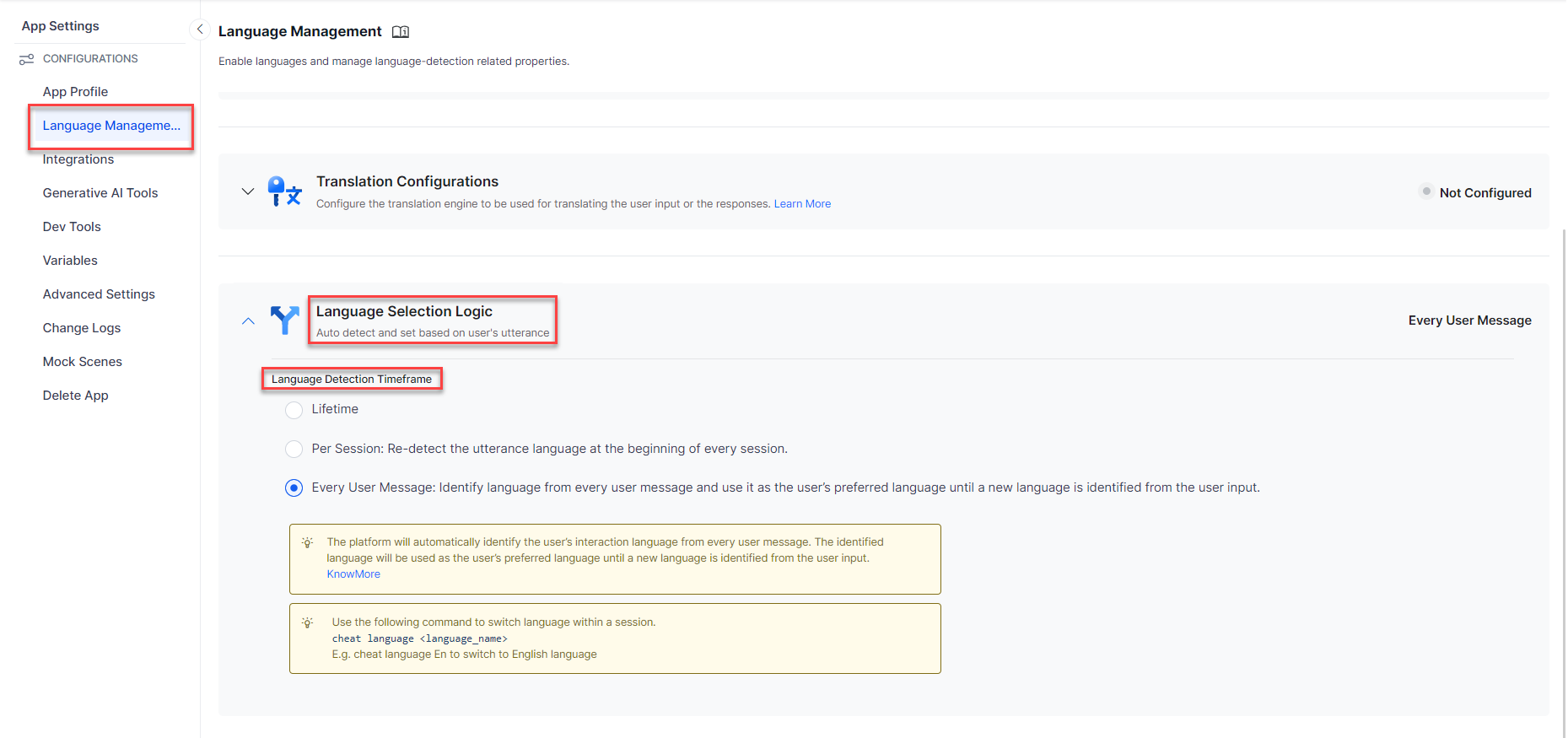 - Every User Message: Identifies the user’s language from every utterance. In case a change is detected, the AI Agent will get a confirmation from the user regarding the switch and proceed as per the user response.