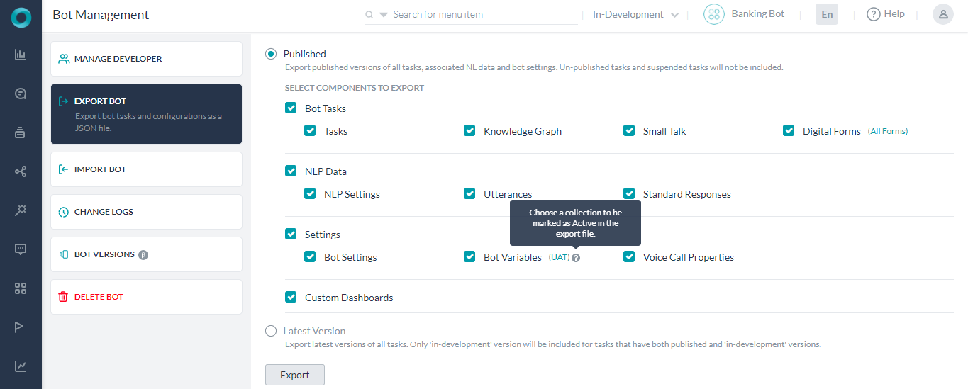 - The Bot Export file would contain the details of all the collections as well as the collection-specific values. The setting of a collection as ‘active’ would be reflected in the export file
