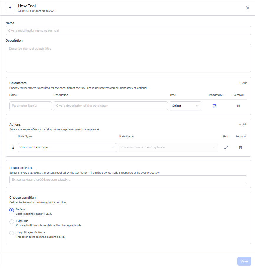 - Actions: These are the nodes that the Platform executes when the language model requests a tool call with the required parameters. Users can add up to 5 actions for each tool. These actions are chained and executed sequentially, where the output of one action becomes the input for the next.