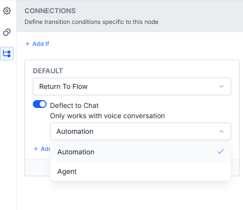 Define the transition conditions from this node. These conditions apply only to this instance and will not affect this node’s use in any other dialog. For a detailed setup guide, See Adding IF-Else Conditions to Node Connections for a detailed setup guide.