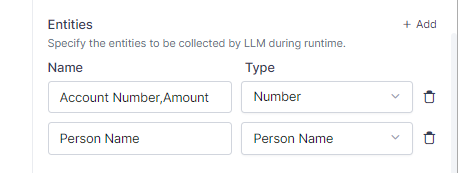 Specify the entities to be collected by LLM during runtime. In the Entities section, click + Add, enter an Entity Name, and select the Entity Type from the drop-down list.