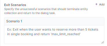 Click Add Scenario, then enter short, clear, and to-the-point phrases that specifically tell the generative AI model when to exit and return to the dialog flow. For example, Exit when the user wants to book more than 5 tickets in a single booking and return "max limit reached".
