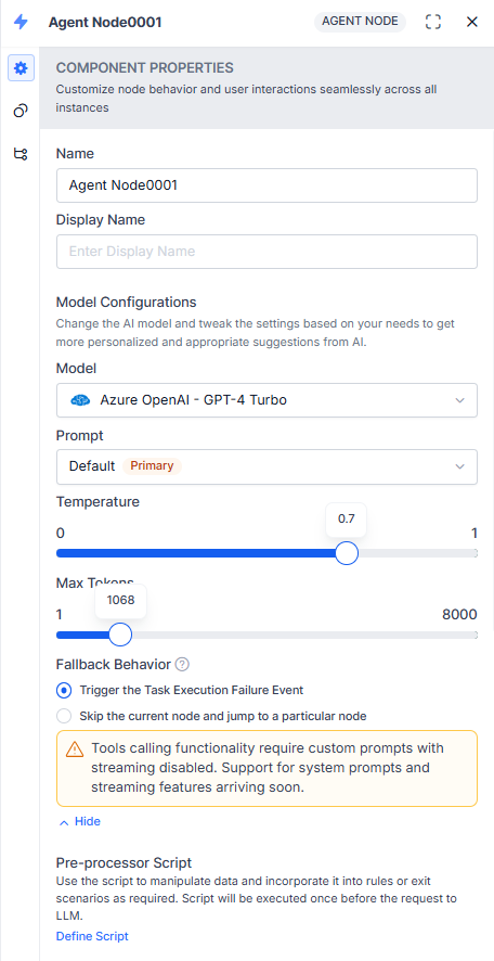 - Input Processing: When the agent node receives user input, it processes it first through a Pre-Processor script. This script runs only once before the orchestration starts between the node and the platform. This script can perform tasks like formatting the input or extracting relevant information before sending the input to the language model.