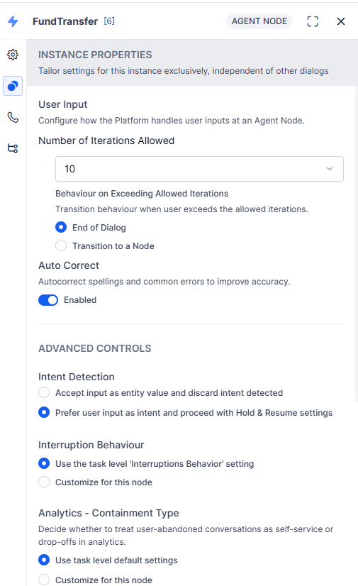 - Customize for this node: You can customize the Containment Type for this node by selecting this option. You can choose whether to Self Service or Drop-off in case of user-abandoned conversations.