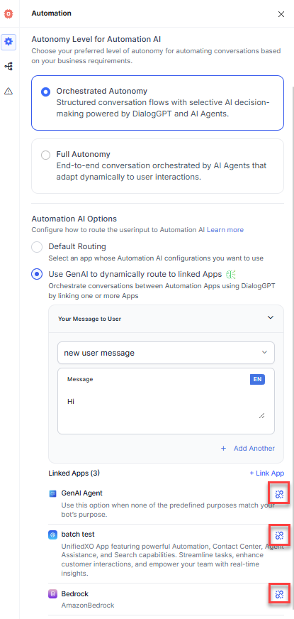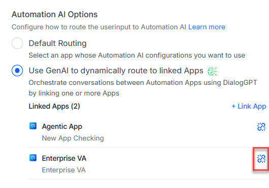 - In the Automation AI Options section, select Use GenAI to dynamically route to linked apps. If DialogGPT is disabled, follow the onscreen instructions to enable it.