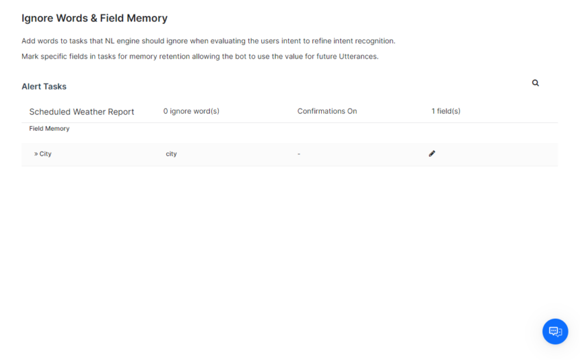 - The task fields are the parameters defined for the selected task. To define ignore words for a task, hover over the task, and then click the Edit icon.