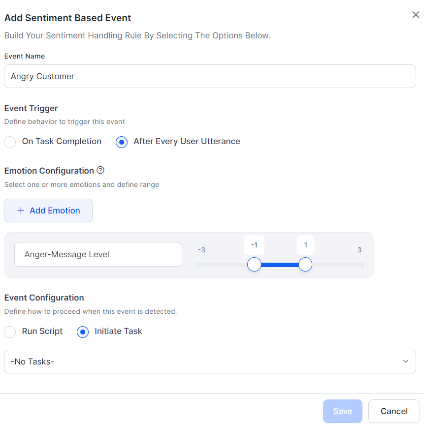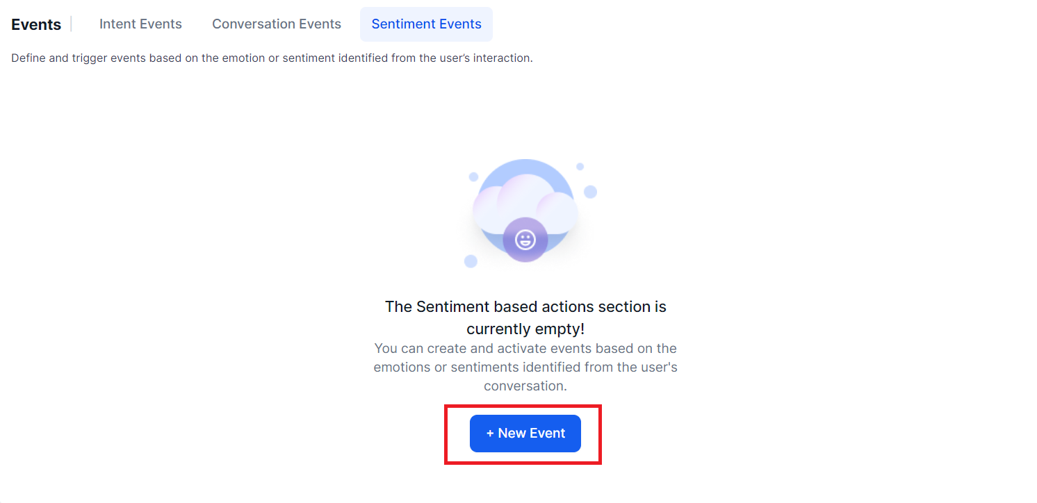 You can define multiple sentiment events from under Conversation Intelligence > Events > Sentiment Events. Click + New Event to define an event based on which to capture the user’s emotion.