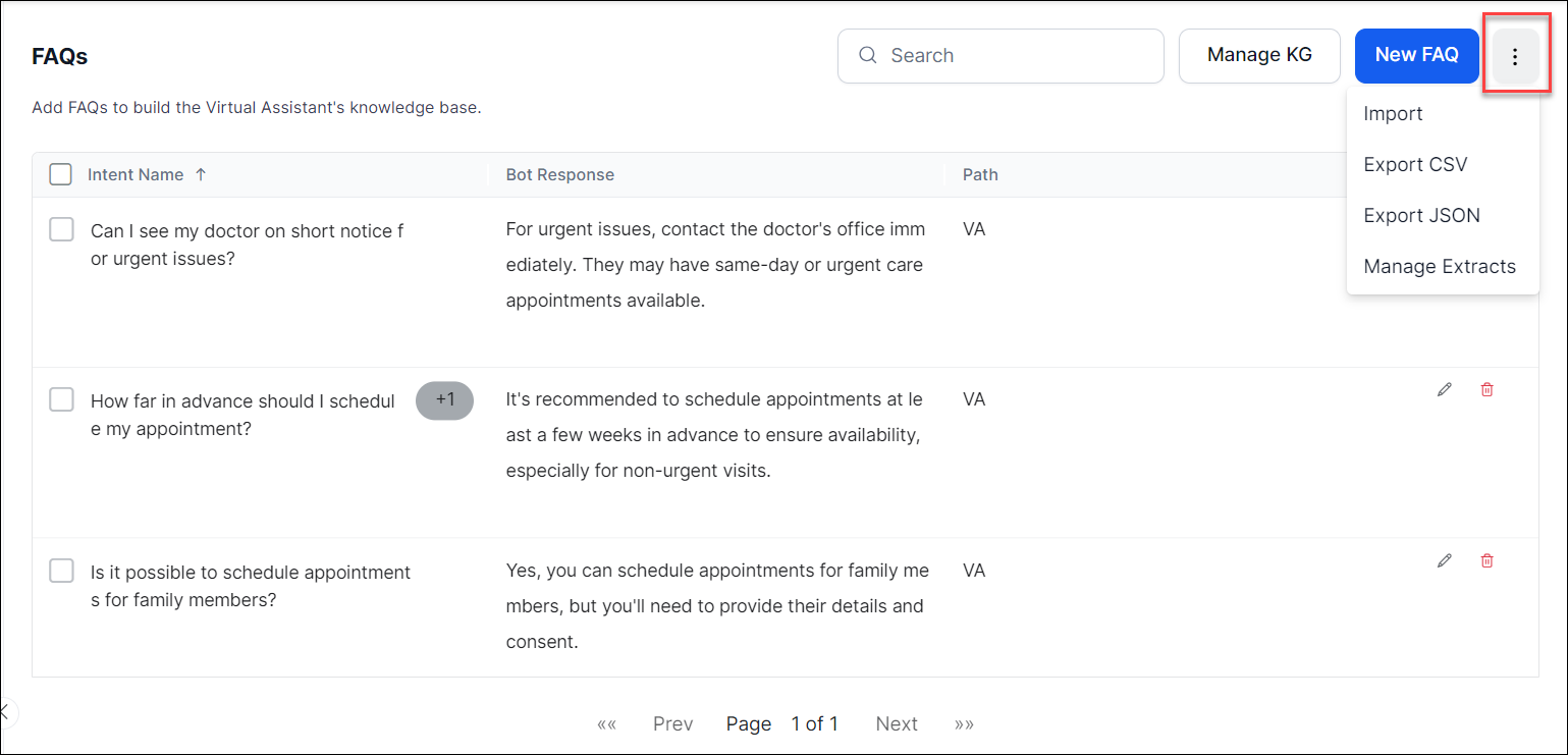 - To export the KG and go to Automation AI > Knowledge AI > FAQs.