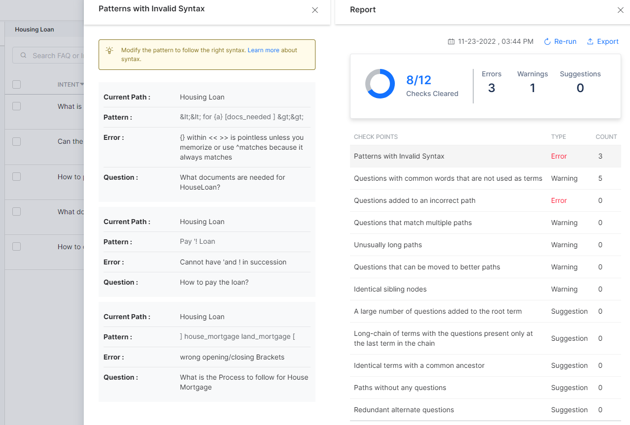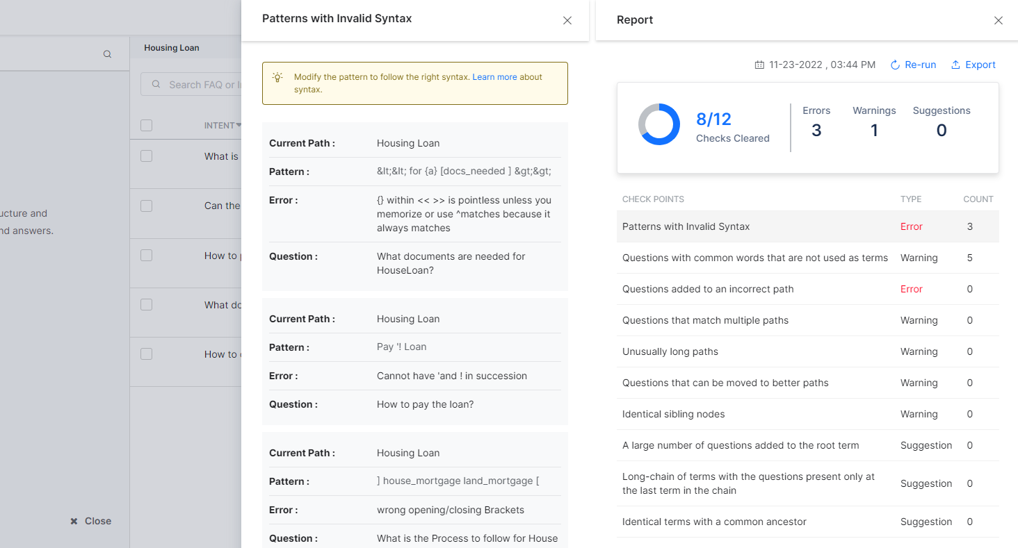 You can also add patterns as alternate questions for an FAQ to provide better coverage, which helps in detecting the right FAQs for a user question. KG Inspect helps in identifying any syntax errors that occur knowingly or unknowingly while defining patterns. The platform analyzes the KG and provides a report of the analysis. The identified incorrect patterns in KG are displayed in the report.
