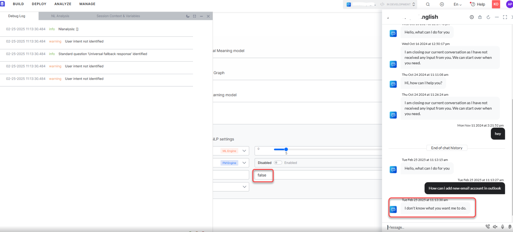 The Machine Learning (ML) engine is responsible for analyzing and assessing user inputs to construct and refine a model. The ML model's primary goal is to categorize user inputs into predefined intents for which it has been trained. Nonetheless, when confronted with out-of-context utterances, the ML system may erroneously attempt to associate them with the incorrect intent.