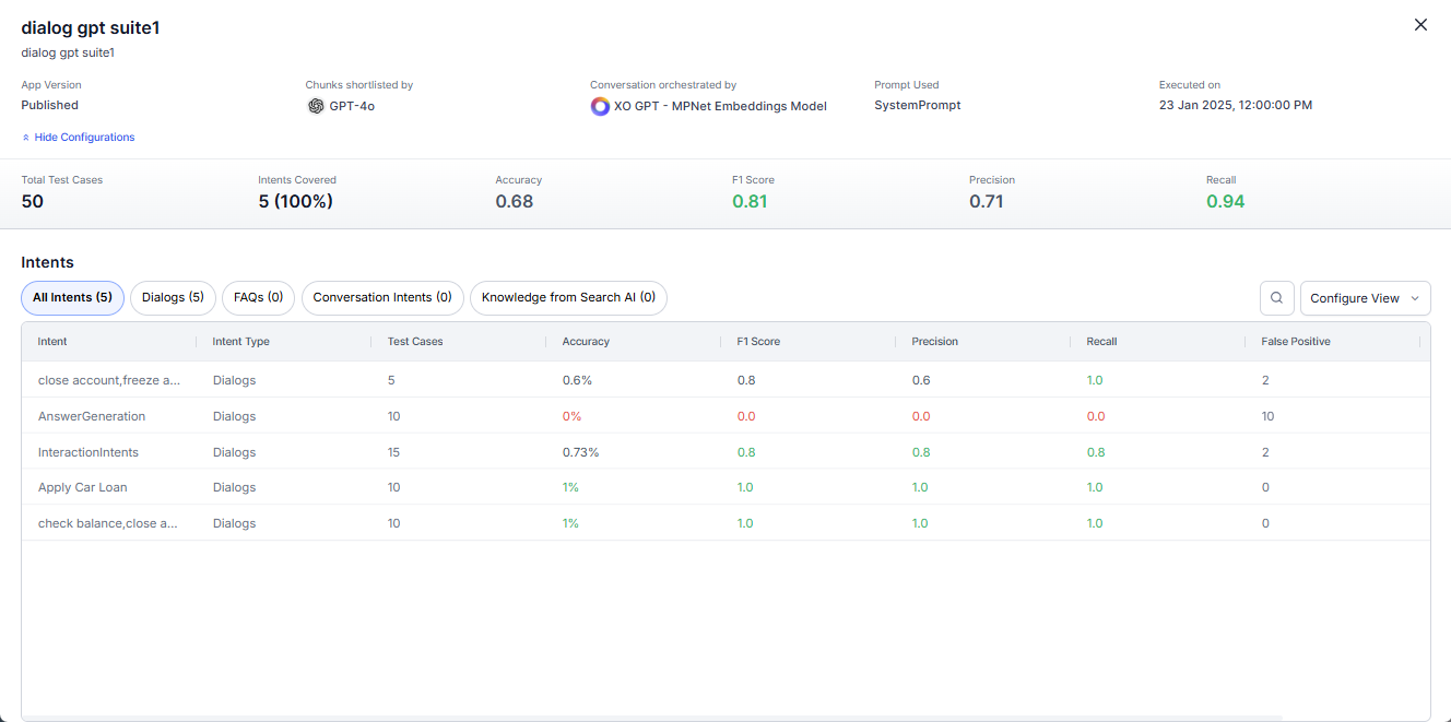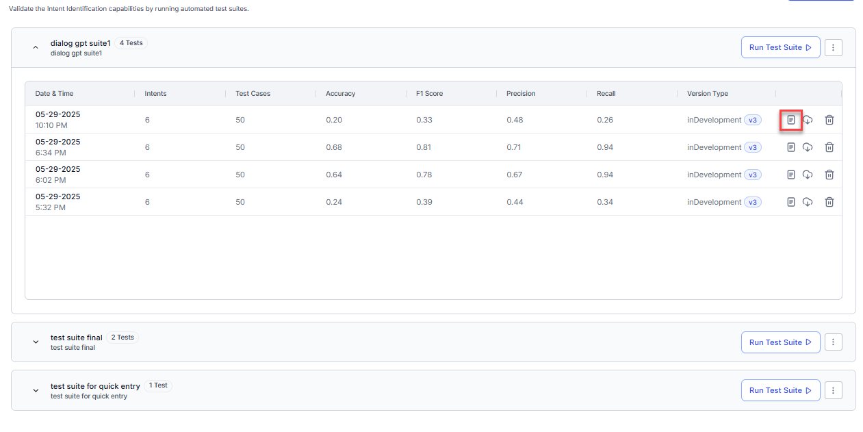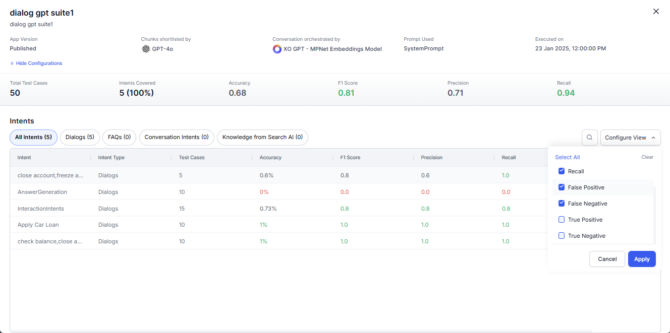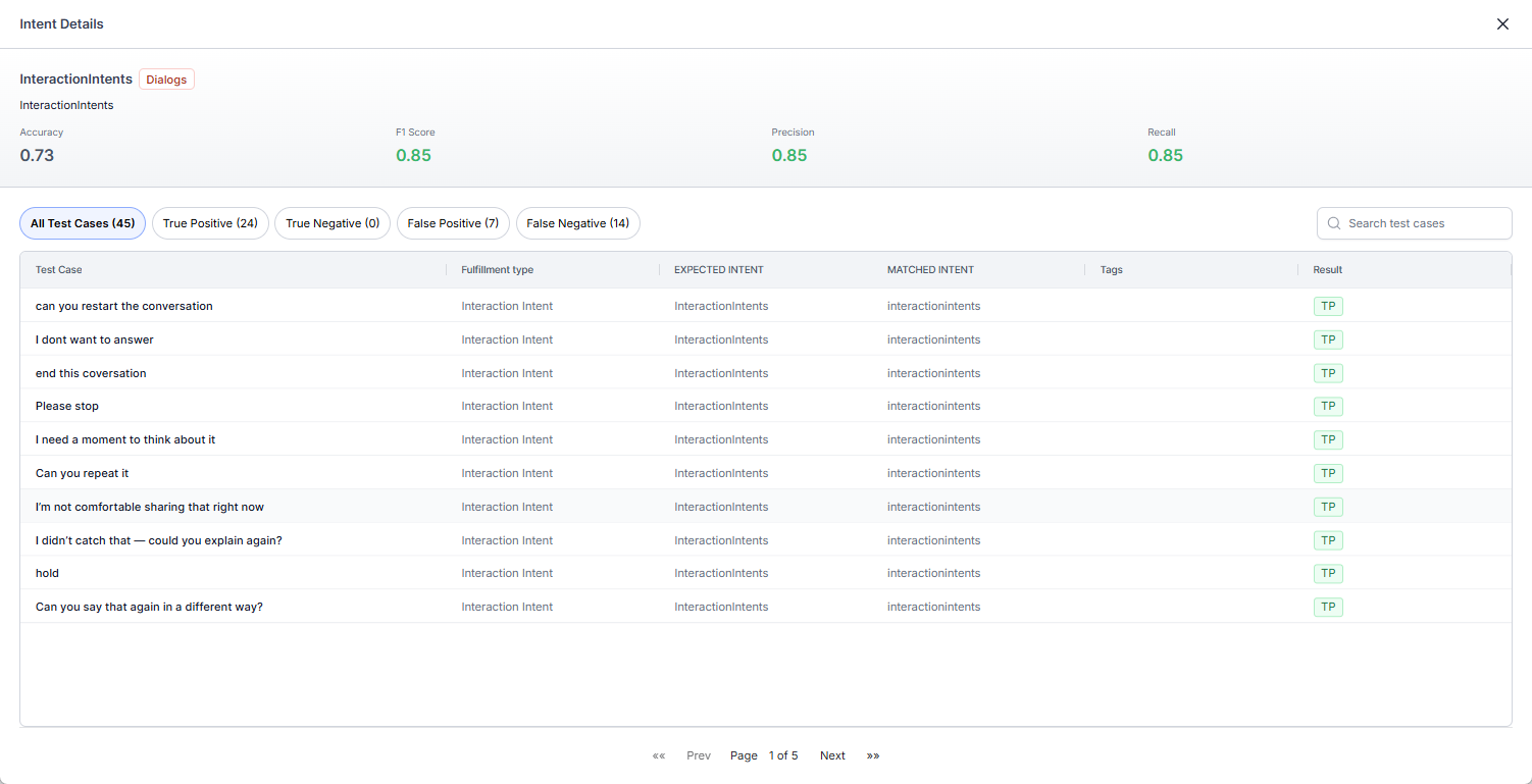 - Granular Performance Insights: Measure accuracy, precision, recall, and F1 score across all conversation types, including Dialogs, FAQs, Knowledge, and Conversation Intents.