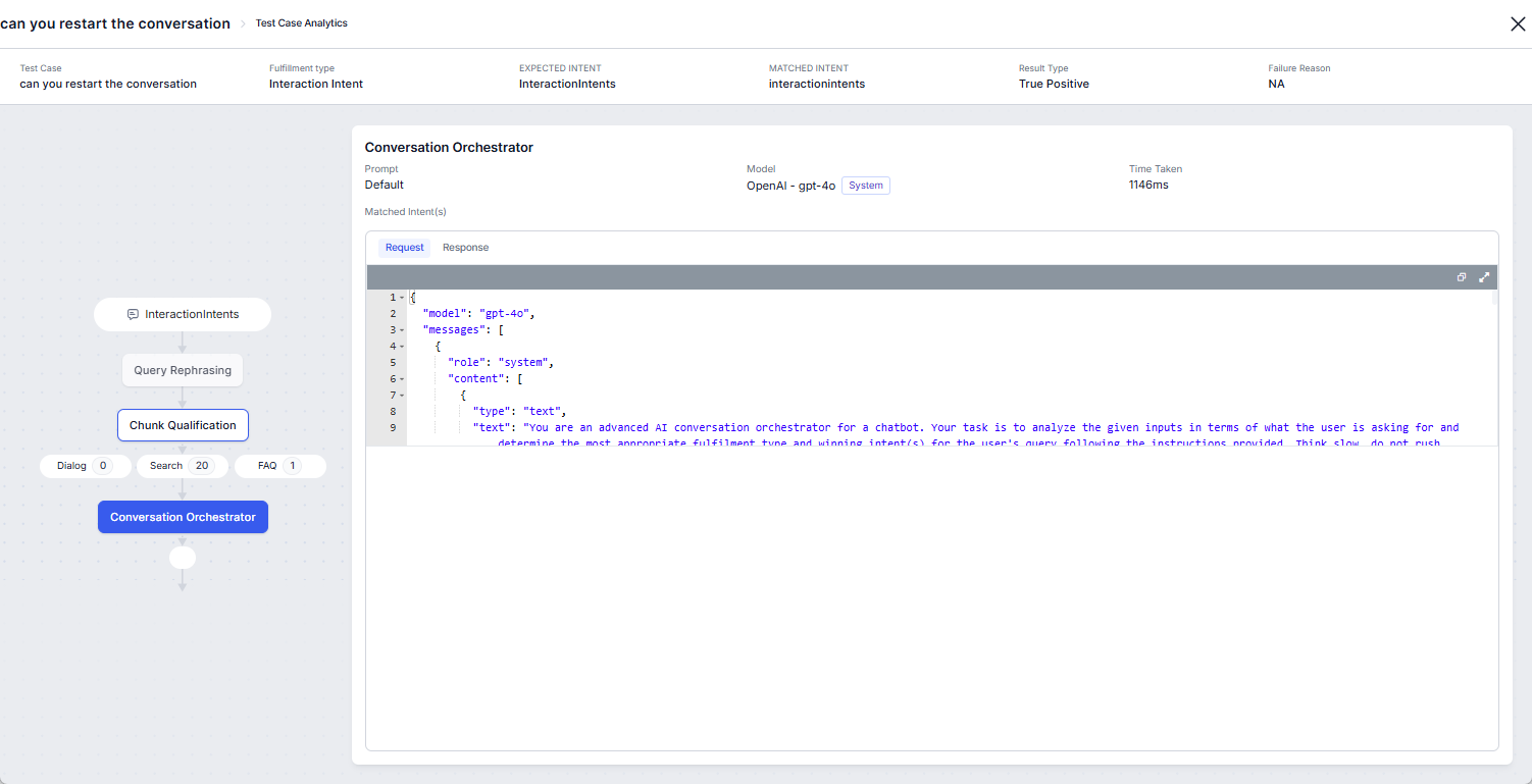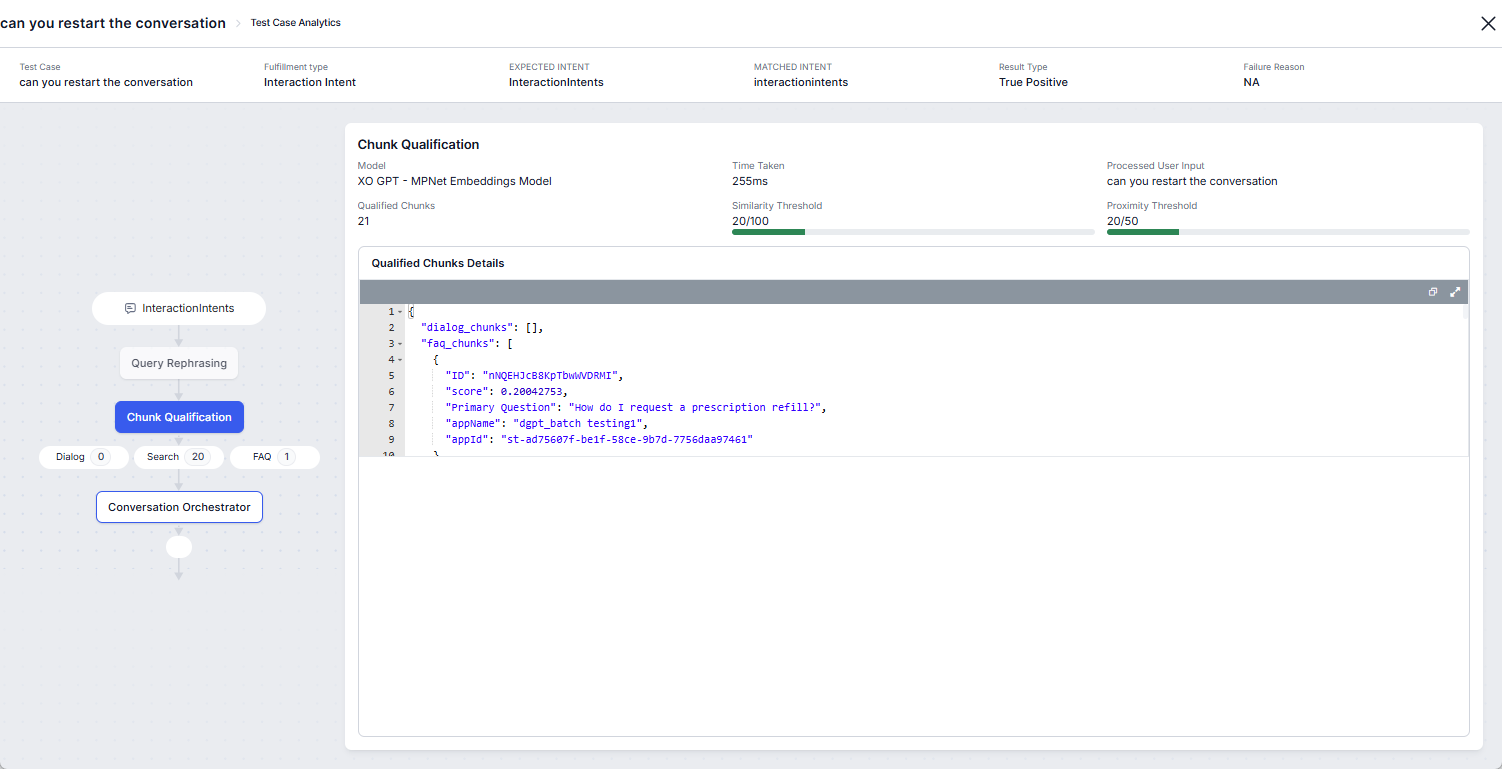 During execution, the batch testing engine performs granular validation by comparing the expected and detected conversational intent types. The test results clearly display both values to help you identify mismatches and ensure accurate dialog handling.