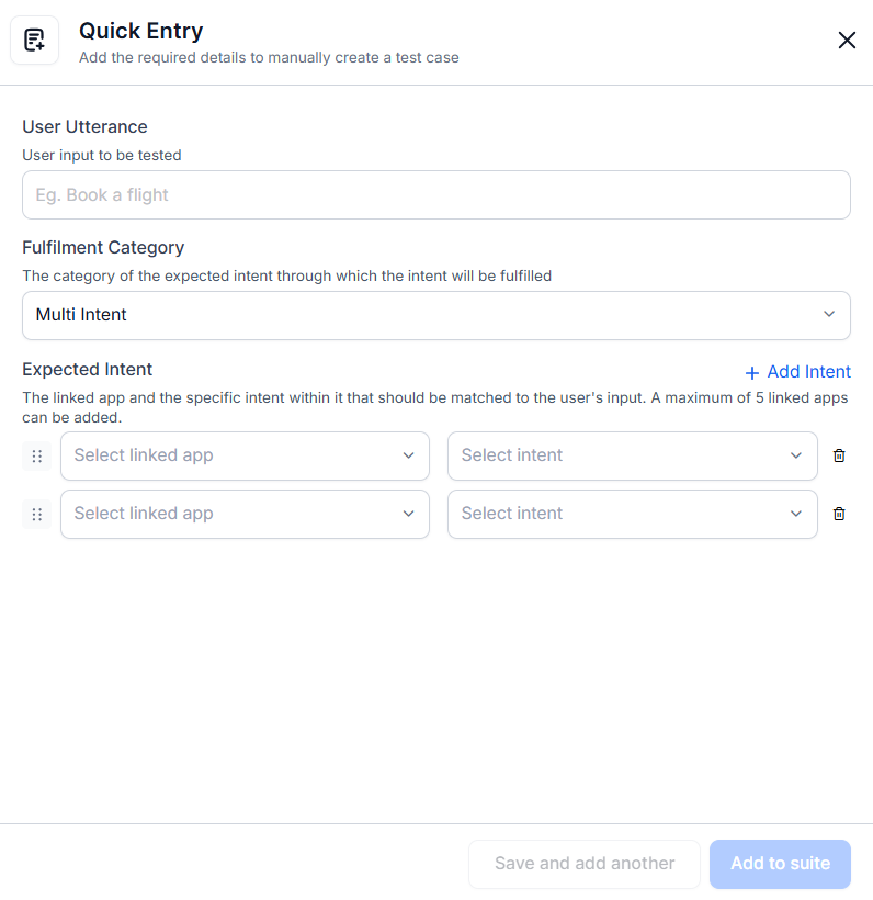 Add one test case at a time using a form. The form includes mandatory fields such as User Utterance, Fulfillment Type, and Expected Intent. You can review and edit the test case before adding it to the test suite.