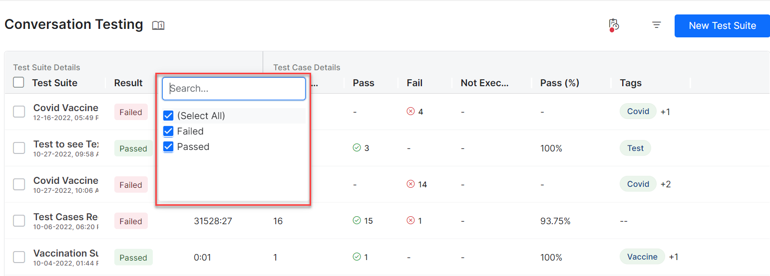 Go to Automation AI > Virtual Assistant > Testing > Regression Testing from the left navigation menu, and then the Conversation Testing tab. to access the Conversation Testing page. It lists all the Test Suites with details in a grid. All the Test Suite details like the Test Suite name, the execution status in the Result column, Duration of execution, Number of passed and failed test cases, Number of test cases not executed, the percentage of passed test cases, and tags added to the test suite during its creation are all displayed in the grid. Using tags, you can easily organize the test suites and filter them.