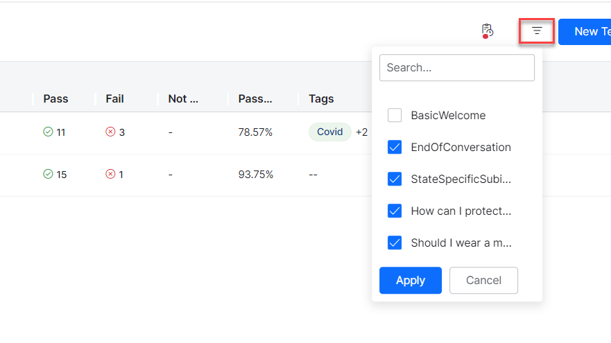 You can also filter the details at the grid level by applying filters for intents covered in all the test suites.
