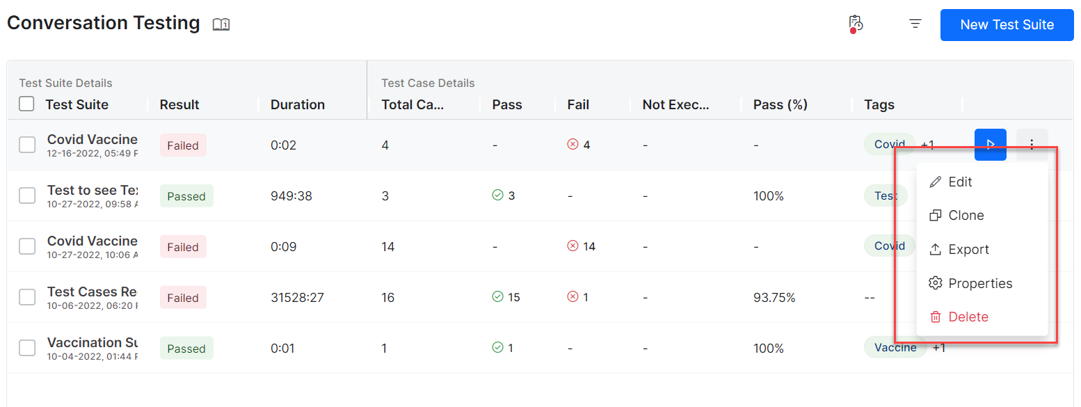 On the Conversation Testing dashboard, you can edit the test suite, clone, export, or delete it, as shown in the following screenshot. You can also rearrange the order of the columns by dragging and placing them in a different place in the grid.
