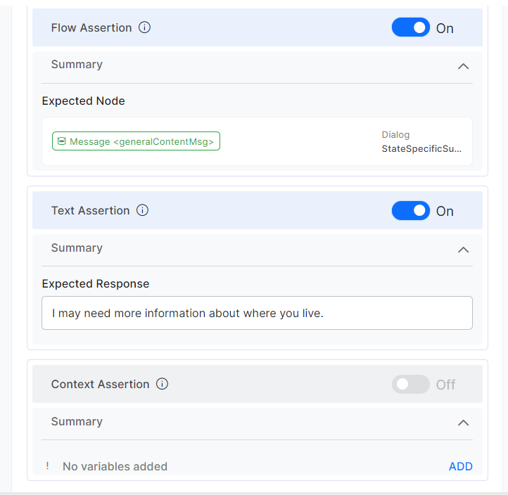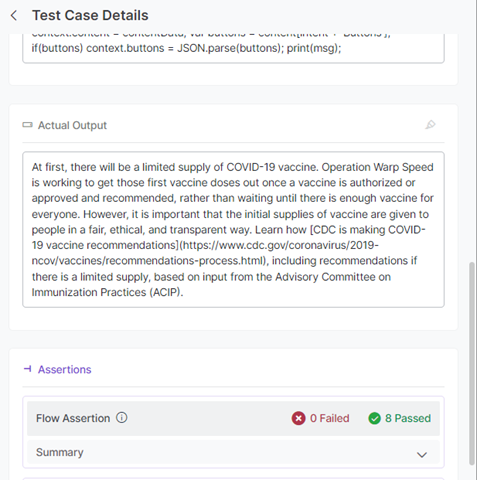 - In case of multiple responses in the Expected Output (when a node has multiple variations), one of the expected responses must match for the assertion to pass.
