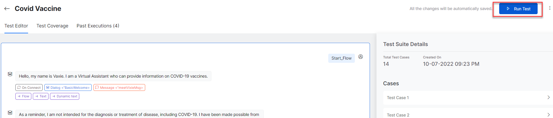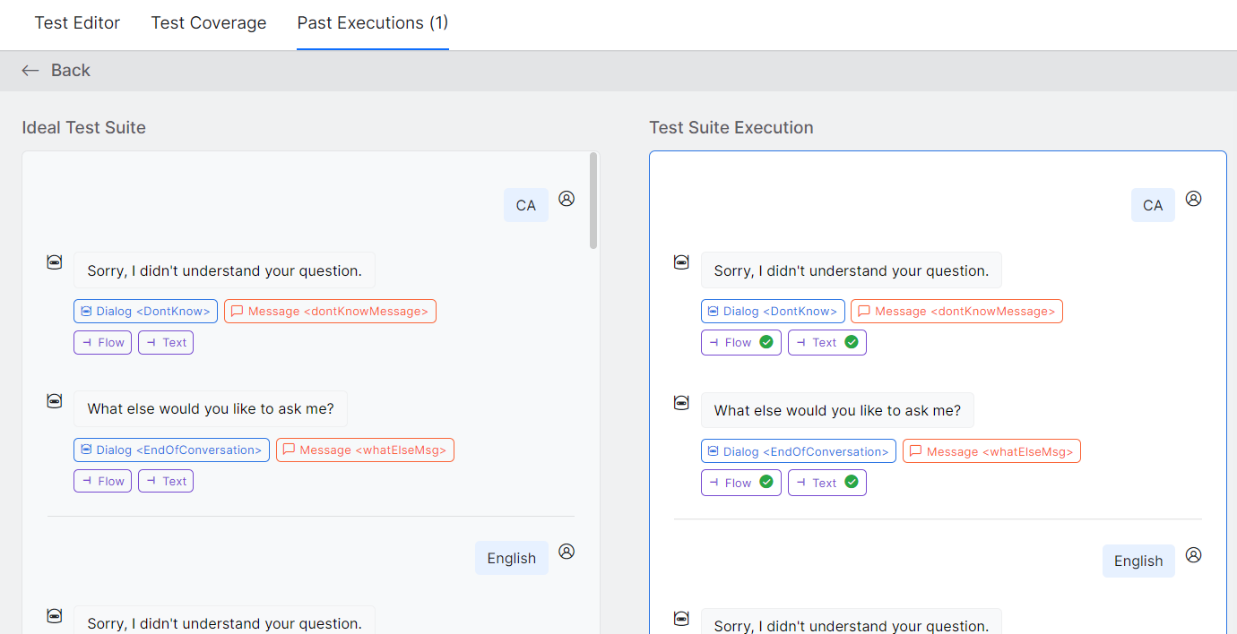 The platform simulates all the user inputs against the current app definition in sequence, as available in the test case. For every user input, the app’s responses are captured along with the metadata. See Capture Test Suite Metadata under Validate Test Suite to know more.
