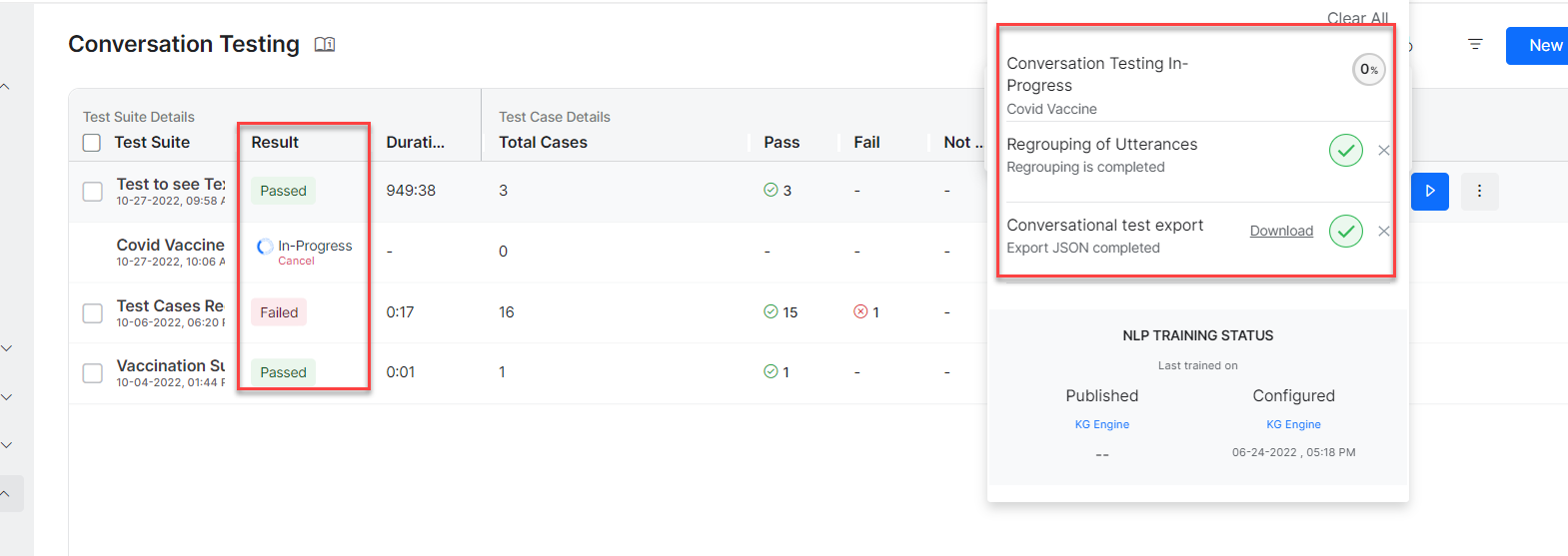 The following sections explain the options available on the Conversation Testing to execute the test cases and interpret the results, which help analyze the performance of the test suite as a whole and the individual test cases.