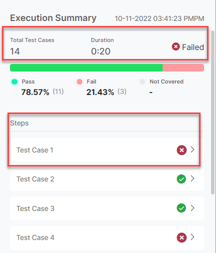 The Test Case Execution Summary allows you to view the test case results, identify the failed test cases, and resolve the flow of the app. It gives complete details of the overall test results and the defects found.