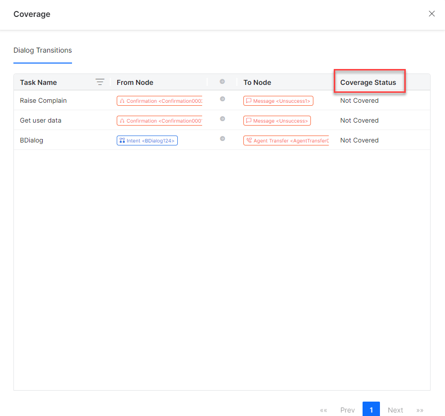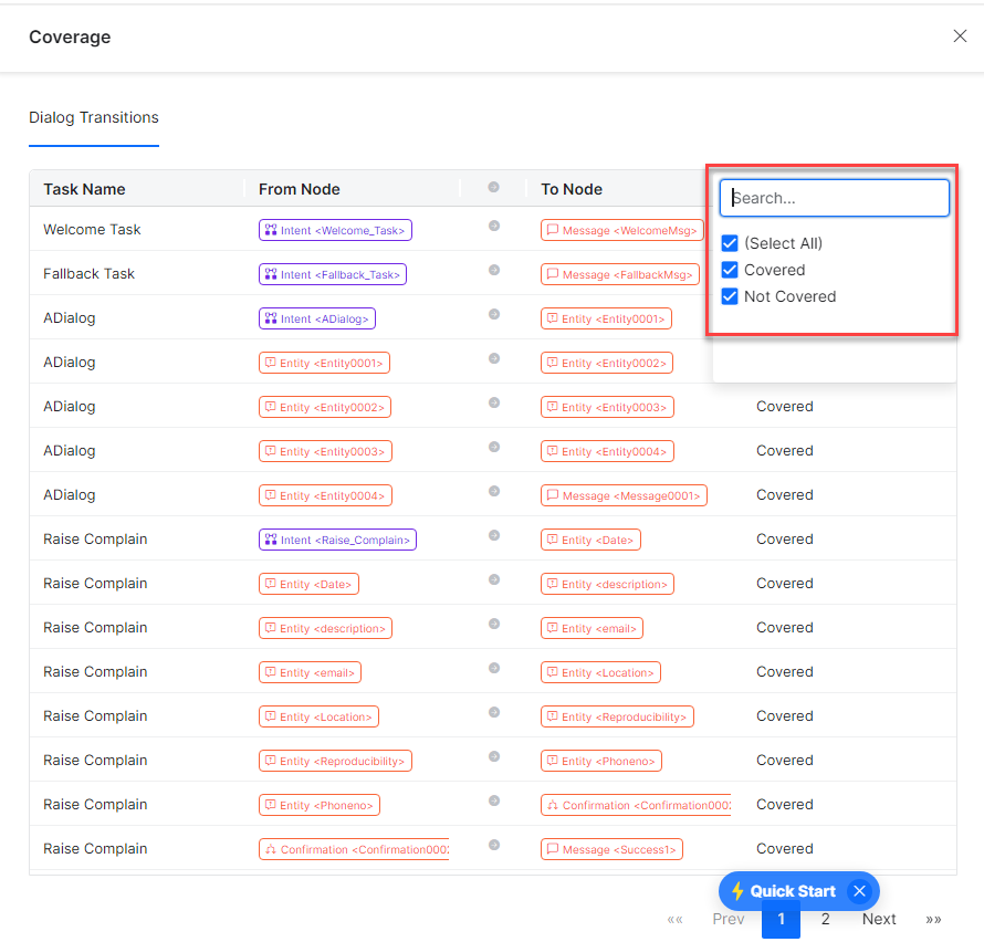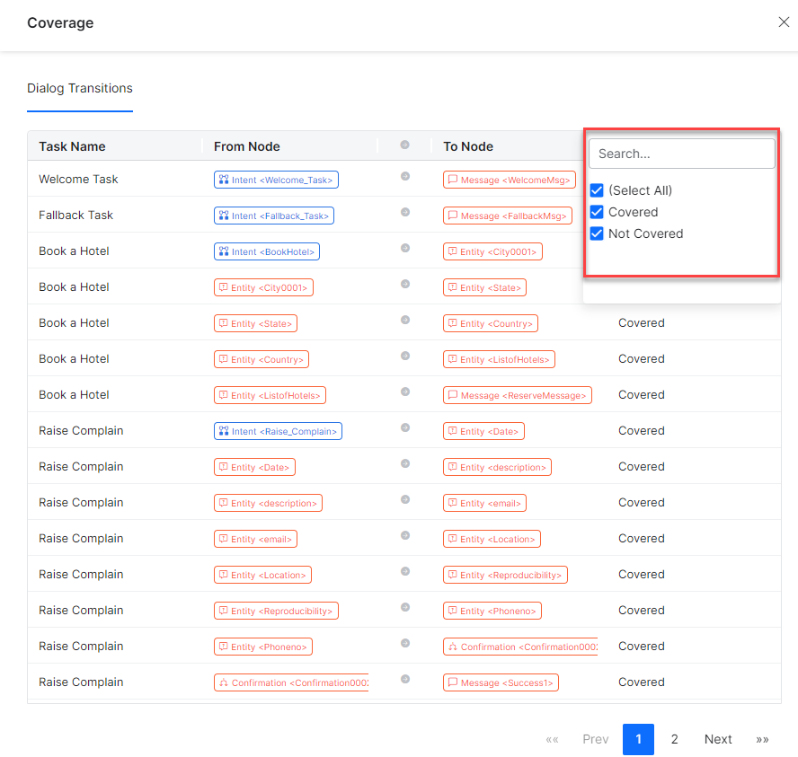 icon to search and filter the dialog intent tasks for which you want to see the transitions coverage. You can filter transitions using the From Node, To Node, and Coverage Status filters. For example, in the Status Coverage column, click the to select all, covered, and not covered statuses, as shown below: