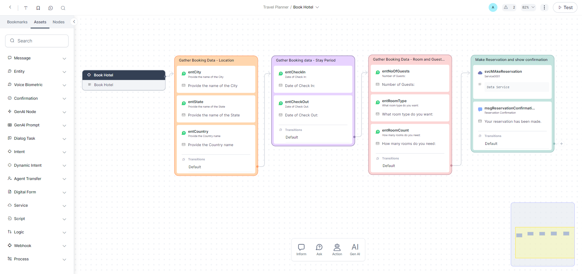 A transition shows how a user intent is transferred from one sequence to another sequence in a dialog task. A transition is a flow of intent between two sequences. It has a From sequence and a To sequence. For example, Book a Hotel is a user intent in a dialog task. A entCity is an entity node in the Gather Booking Data - Location sequence within dialog flow to which the book a hotel user intent is transitioned, and after going through all the nodes in this sequence, it transitions to the Gather Booking data - Stay Period sequence. From there, after all nodes in it are executed, it transitions to Gather Booking data - Room and Guest details and finally MAke reservation and show Confirmation sequences. Therefore, in the Book a Hotel task, you have three transitions in total. For more information, see User Intent.