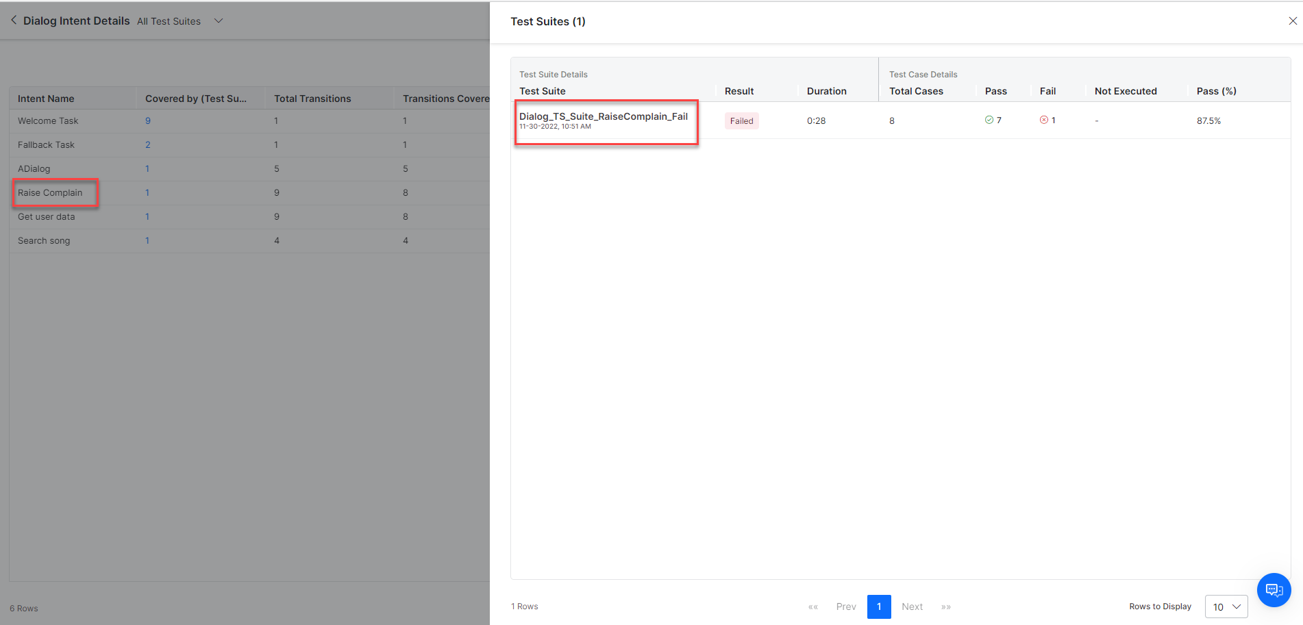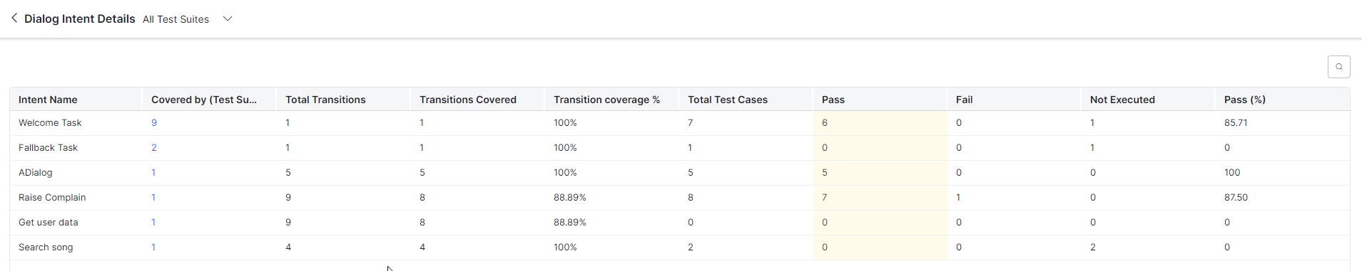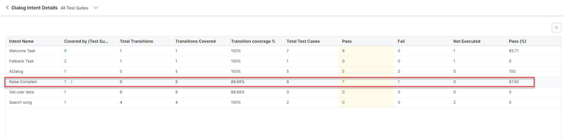In the Dialog Intent Details window, click on Covered By for any Intent Name to view the summary. For example, the Raise Complain intent is covered in a test suite with a total of Nine transitions, out of which only Eight are covered and One is missed. The total number of test cases in this intent are Eight, out of which Seven have passed and One has failed, with Zero test case not executed.