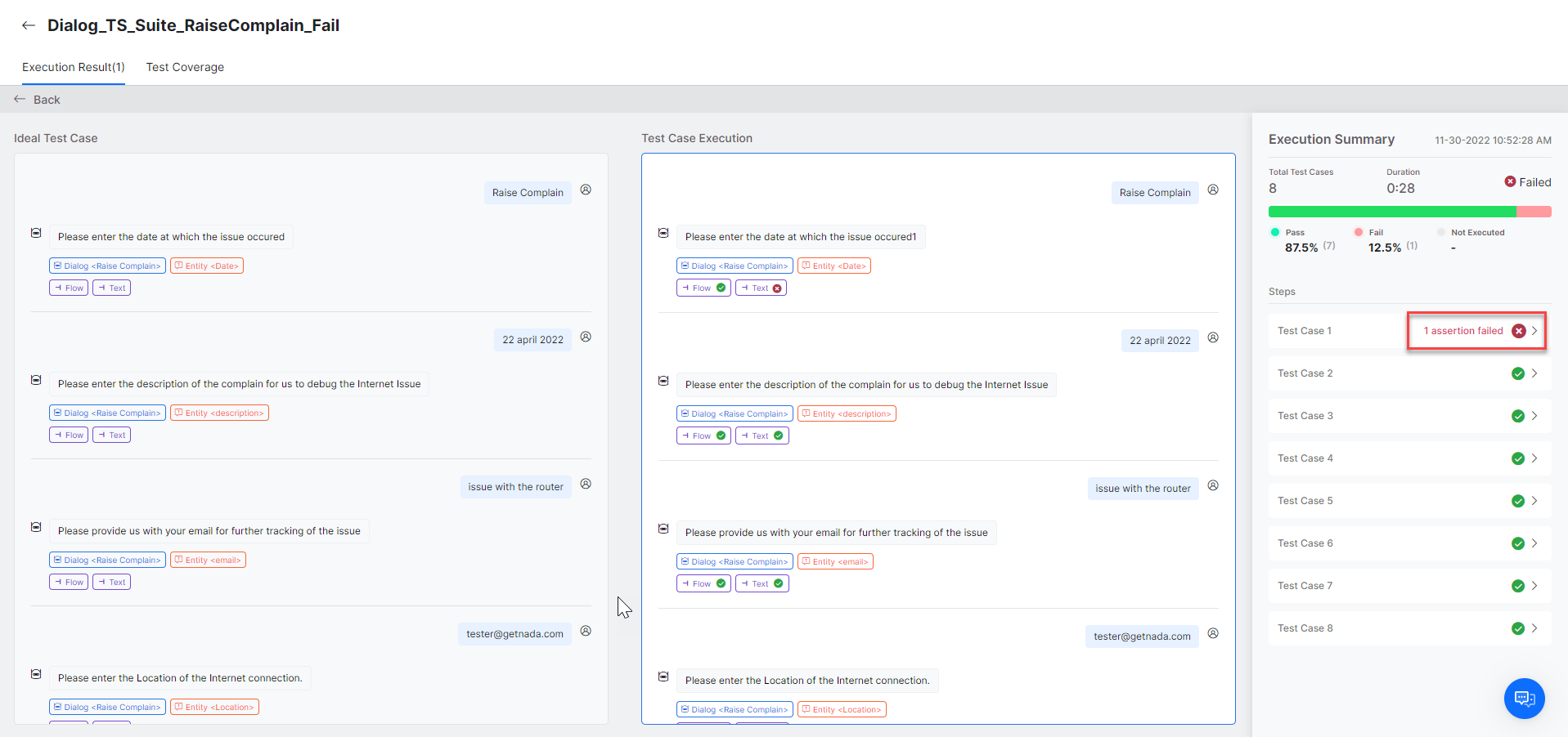 Click the Test Suite Name to analyze how the test suite is performing. For example, click the Dialog_TS_Suite_RaiseComplain_Fail test suite to view the test results analysis as illustrated in the screenshot below: