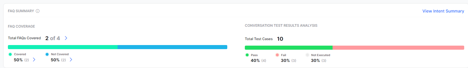 The FAQ Summary section displays the FAQ Coverage and Conversation Test Results Analysis generated for all the FAQ intents in all the test cases of the selected test suite, as discussed in the View Intent Summary section.