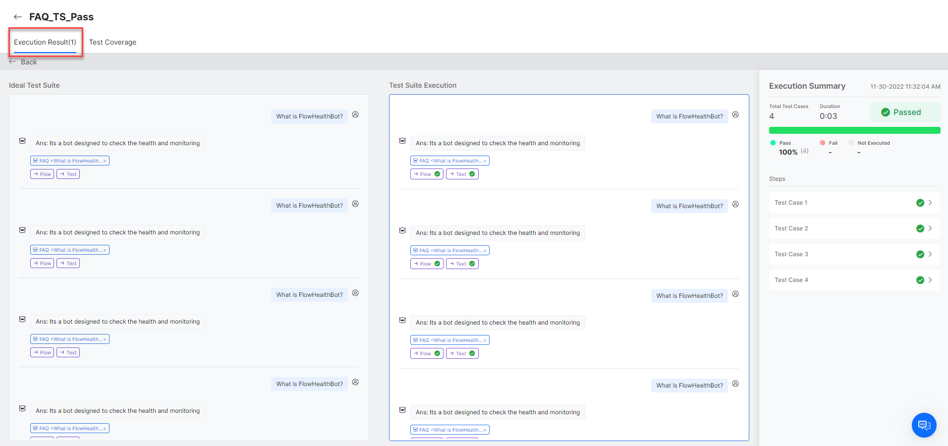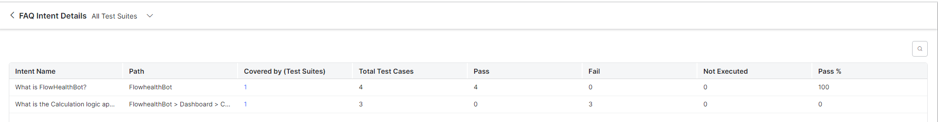 - Total Test Cases: The count of the test cases in the selected test suites for that FAQ intent.