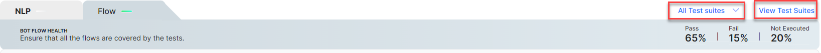 Note: The test suites are used to verify the Intents, Small Talks, FAQs, and Standard Responses with test cases. The Flow Health dashboard considers standard responses in test cases to calculate overall percentages. However, the dashboard has no separate summary tile for the Standard Responses. For this reason, you will notice a slight difference in the test results’ overall count or percentage.