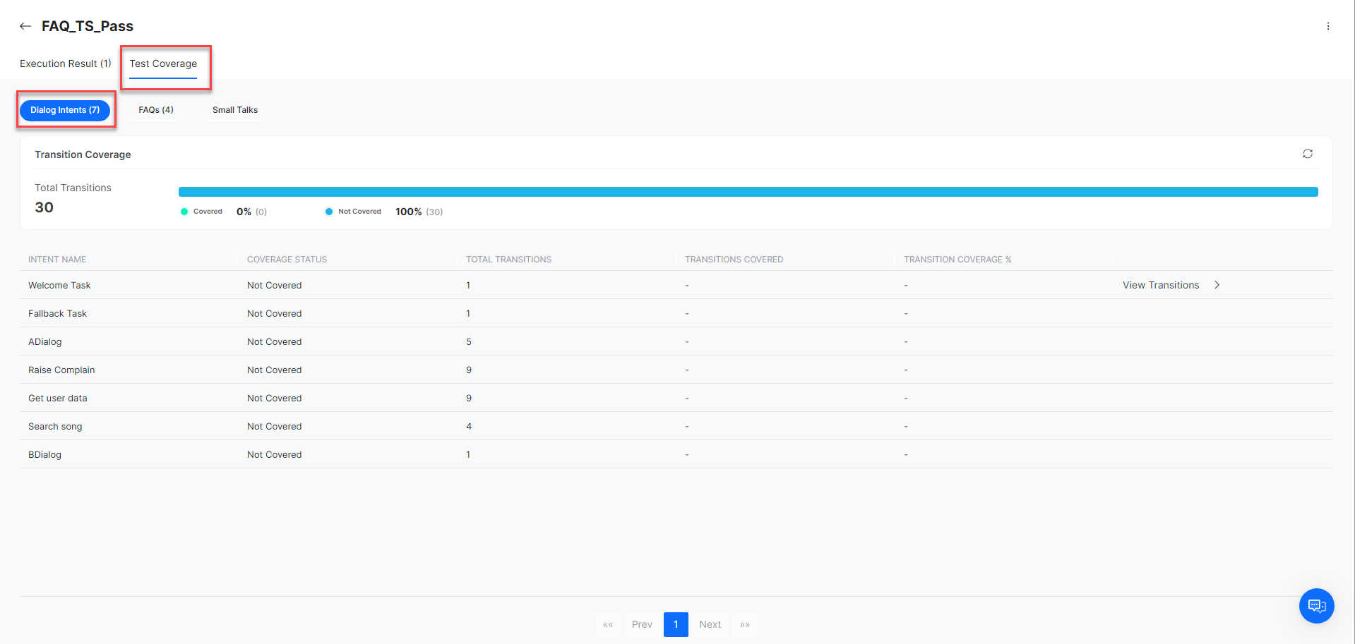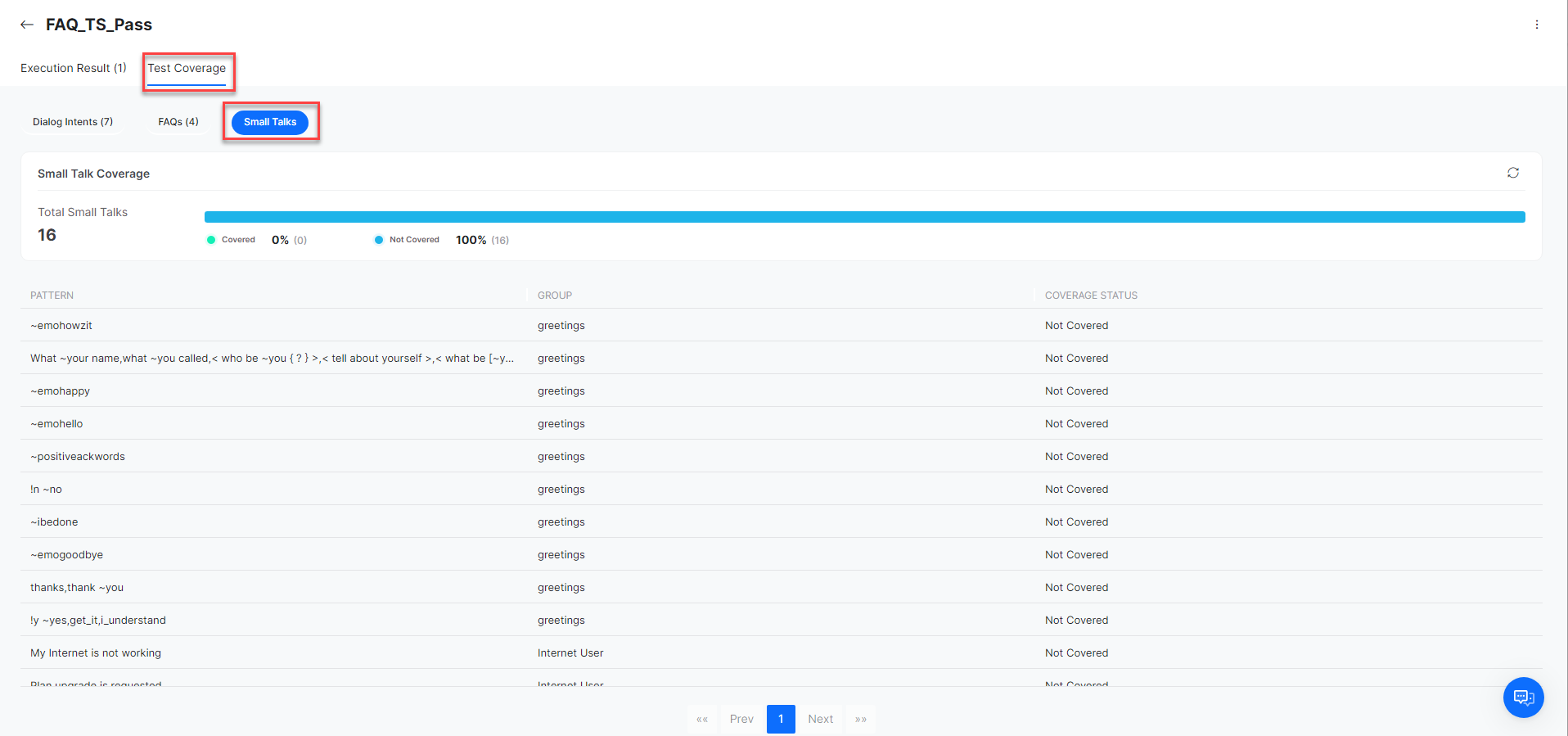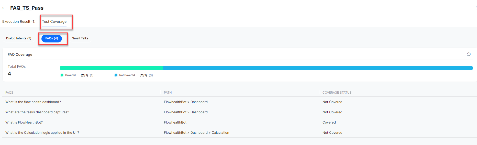 Select the Test Coverage tab to view the Dialog Intents, FAQs, and Small Talks covered and that are not covered in the test suite.