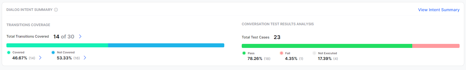 The Dialog Intent Summary shows the summary of test results analysis of dialog intents in the test cases from the Conversation Testing. The Dialog Intent summary also provides insights into flow transitions that are covered and ones that are missed.