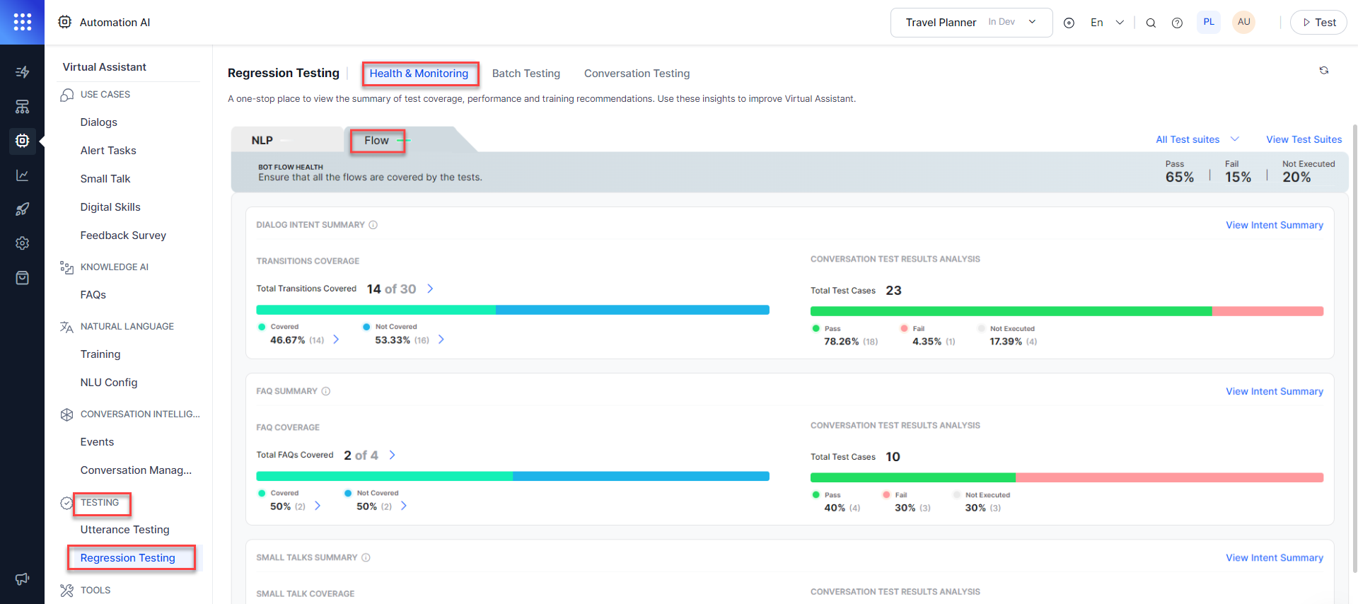 The test suite results are tracked in the Conversation Testing, and the analytics for test suites are displayed in the Flow Health dashboard.