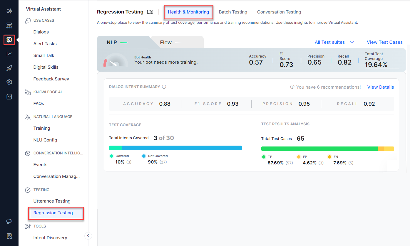 - NLP: This panel extracts all test suite results from Batch Testing and presents insights into your test cases with performance analytics. The key components of this panel include the execution summary, the key performance metrics, and the total test coverage of the selected test suites for the Dialog intents, FAQs, Small Talks, and Traits. The key recommendation scores presented here depict if your virtual app is trained sufficiently or not.