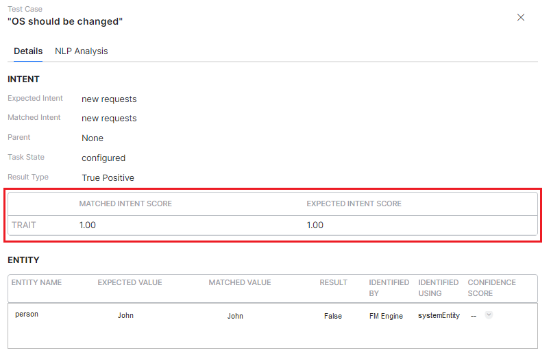| Confidence Score | A score to determine if the test execution resulted in a favorable outcome (high score) or not (low score) when an utterance is trained for the entity. | No | Yes | No |