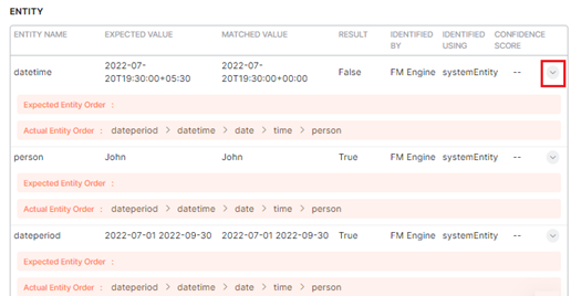 Click the expansion arrow icon under Entity to view the entity order expected by the ML engine and the actual entity order.