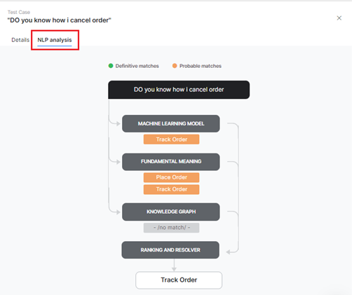 The NLP Analysis section displays the detailed view of the historic analysis generated at the time of the test case execution for failed and successful test cases. For the selected intent type, this section gives an overview of the intents that are qualified (the definitive and probable matches) and disqualified to serve as crucial information for users trying to decode the reason for failed test cases. The following details are displayed as a graphical representation in this section: