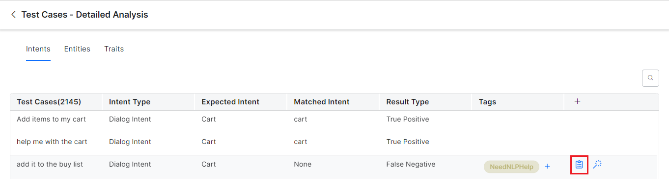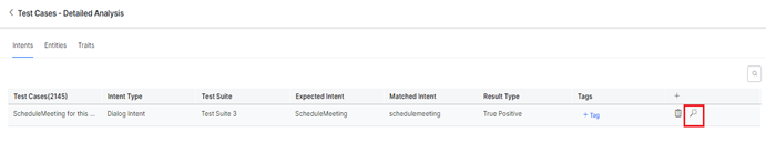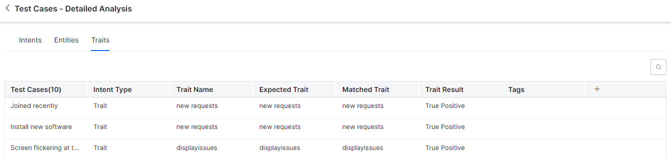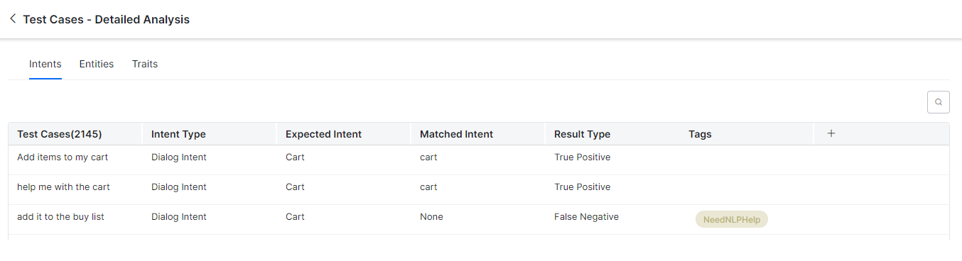 To view the Details section, in the Test Cases – Detailed Analysis window, click the Intents, Entities, or Traits tab. A summary table with the following details is displayed: