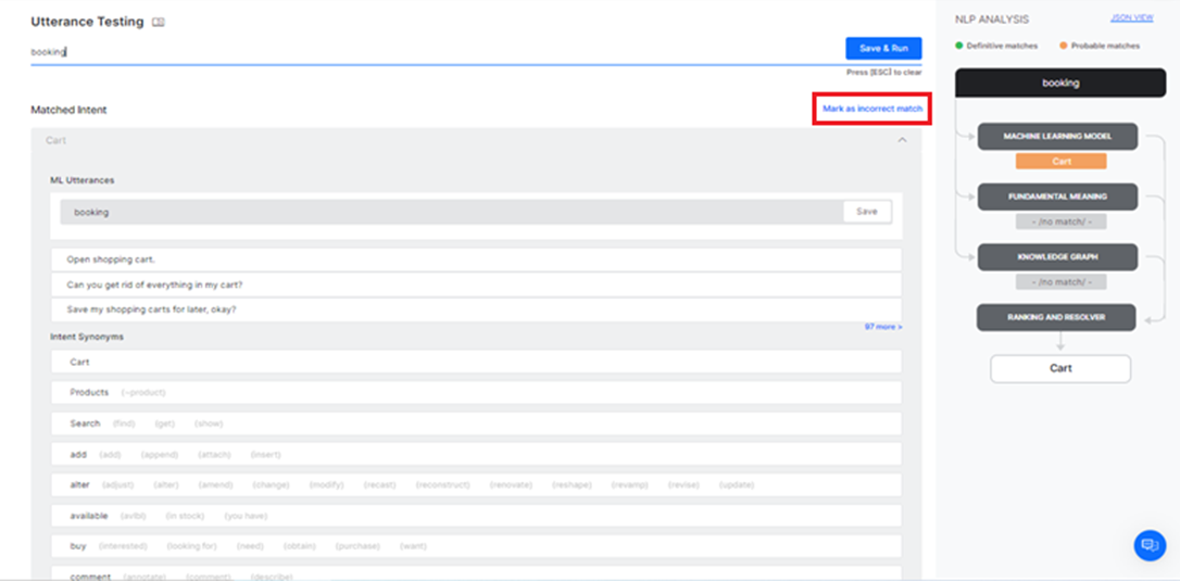 - Use the Mark as an incorrect match link to match the user input with the right intent when it is mapped to an incorrect task.