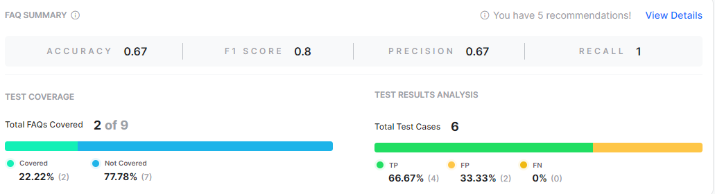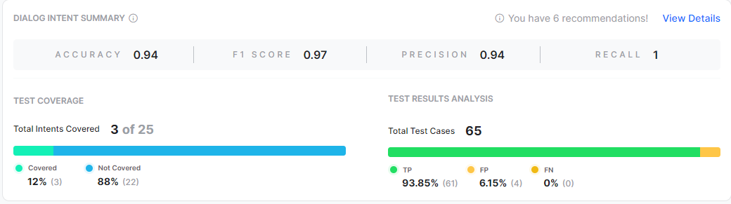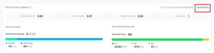 You can view relevant training recommendations for dialog intents, FAQs, or Small Talks when errors and warnings are triggered during the test execution. To view the recommendations summary, click View Recommendations on the top right of the details page.