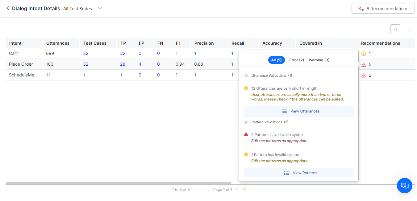 To view the details of the utterance validations, errors, warnings, and recommendations and correct them, click the Recommendations column.