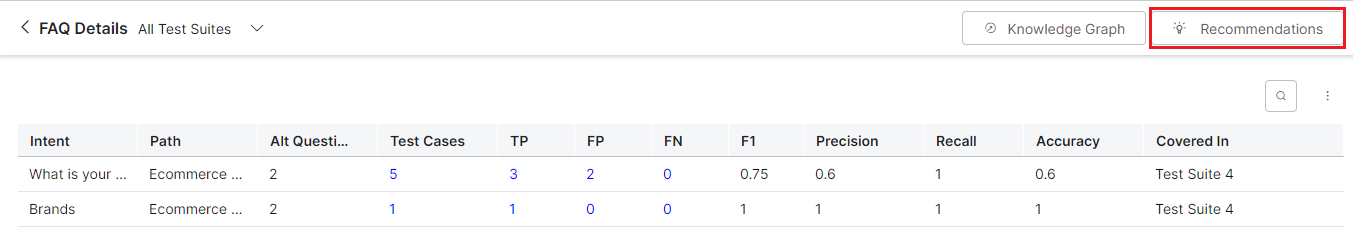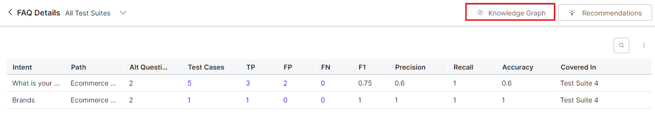 | False Negative (FN) | The count of the intent test cases that resulted in FN. | ||