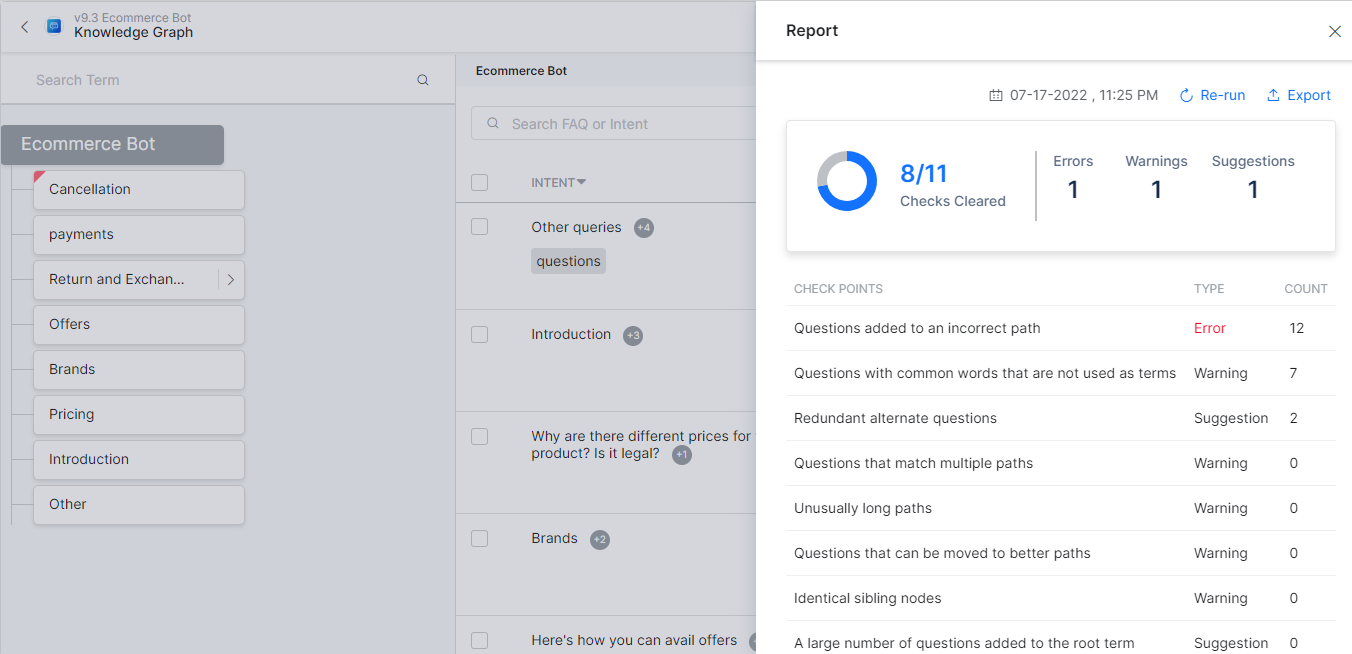 - Identify incorrect intent patterns, short training utterances, incorrect entity annotations, and training recommendations and take corrective action.
