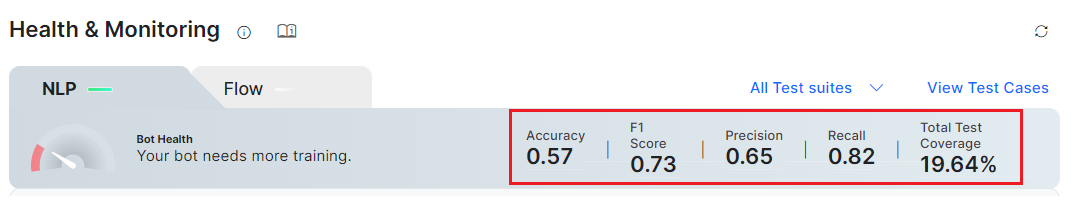 The Health and Monitoring dashboard offers a goal-driven approach to improving the accuracy of the app’s Natural Language Processing (NLP) model. The training data is analyzed along with the test coverage and test results of the test suites to provide insights into the NLP Model’s performance.