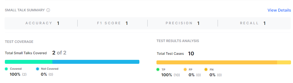 The View Details link in the Dialog intent, FAQ, and Small Talk summary sections provides access to a drill-down view of the key performance metrics and recommendations of the covered intents.