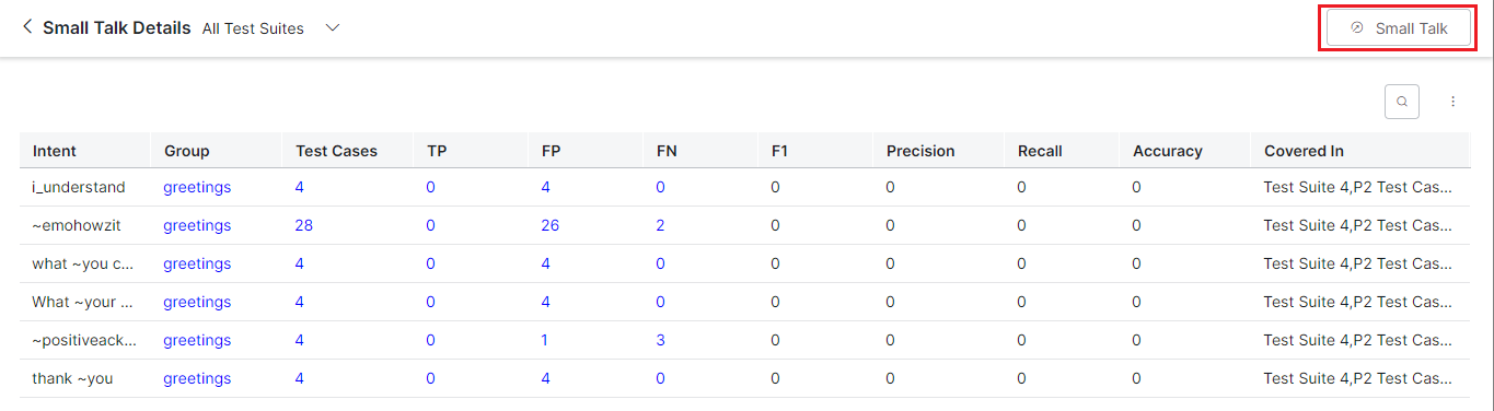 - False Negative (FN): Percentage of utterances that have not matched expected intent. In the case of Small Talk, it would be when the list of expected Small Talk intent is blank but the actual Small Talk is mapped to an intent.