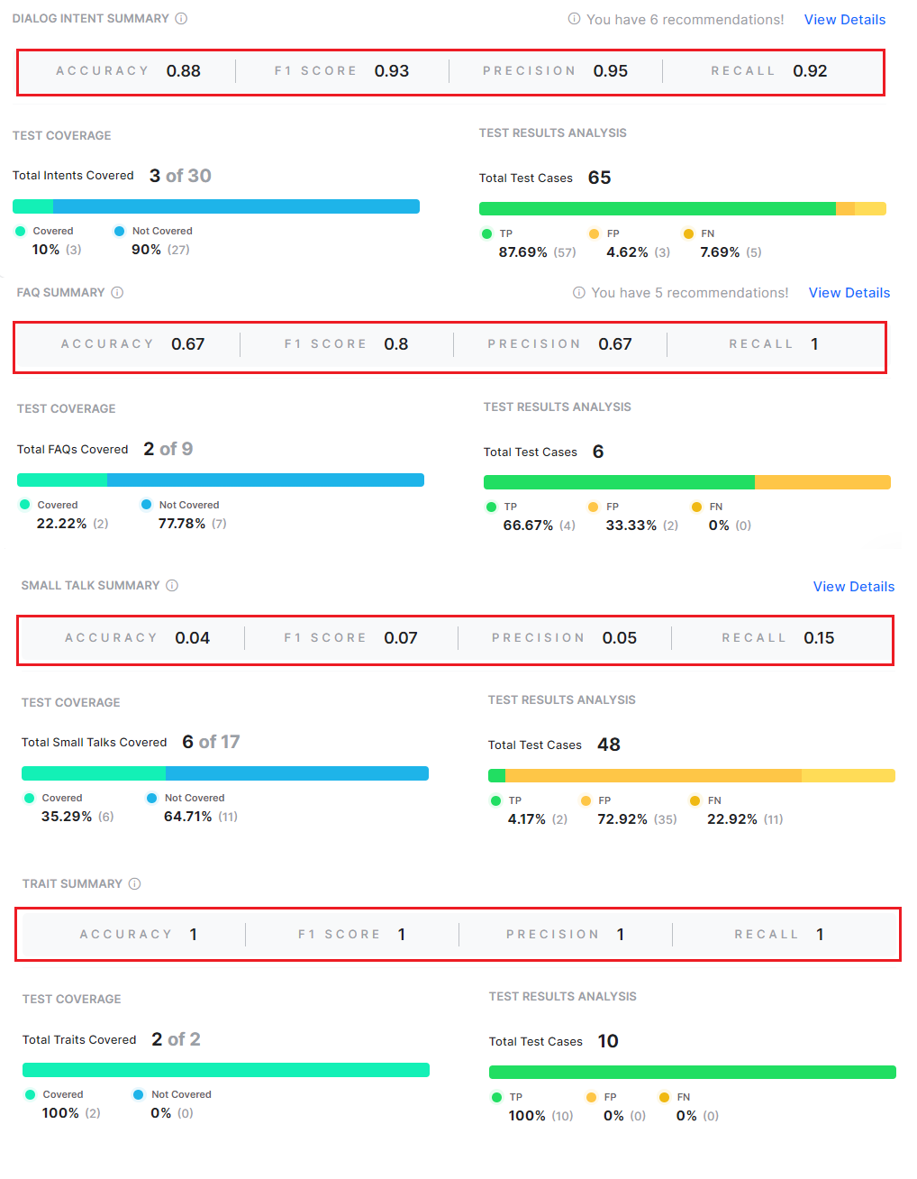 You can view the training data summary with the relevant recommendation metrics for Dialog Intents, FAQs, and Small Talks in the details panel.