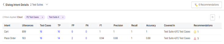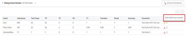 | Recommendations | Displays the count of training recommendations for that intent. Clicking on it will display the summary of the training recommendations and their probable corrective actions. | N/A | N/A |
